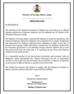 The statement read, “The attention of the Federal Government of Nigeria has been drawn to an alleged ongoing registration of Nigerian volunteers into the fighting force of Ukraine at the Ukrainian Embassy in Abuja.