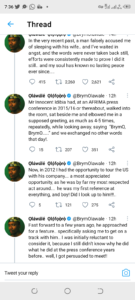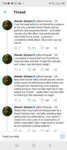 His thread read, “In the very recent past, a man falsely accused me of sleeping with his wife.. and I’ve waited in angst, and the words were never taken back still, efforts were consistently made to prove I did it still.. and my soul has known no lasting peace ever since…