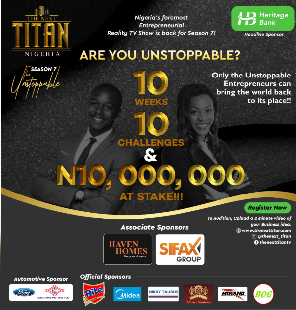 Register for Season 7 of the foremost Entrepreneurial Reality Show, The Next Titan, Sponsored by Heritage Bank in association with Haven Homes and Sifax Group