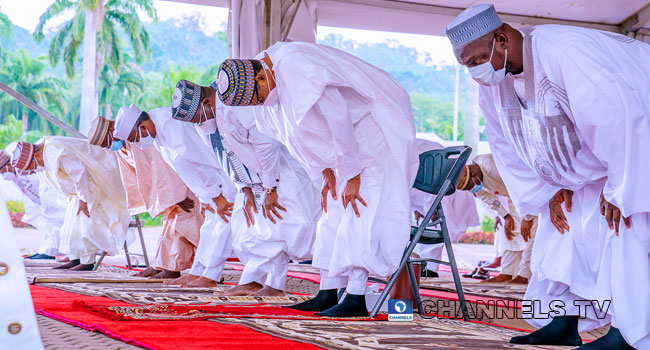 Muslims offer Eid el-Fitri prayers which marks the end of the holy month of Ramadan fasting at the National Mosque, in Abuja, on Thursday, May 13, 2021. Photo: Sodiq Adelakun/Channels TV