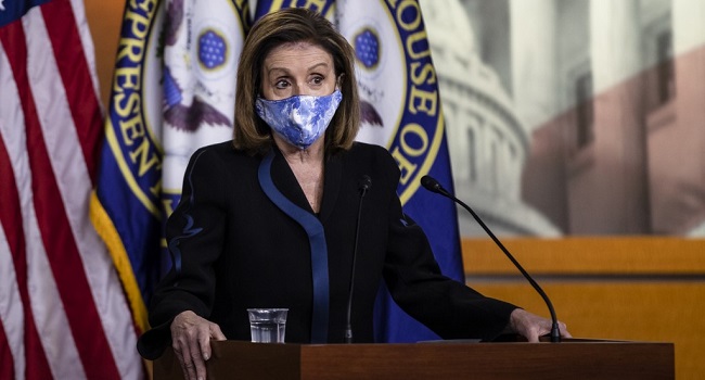 “Our most urgent priority will continue to be defeating the coronavirus,” a masked Pelosi said. “And defeat it, we will.”