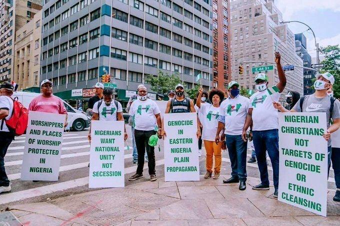 Some Nigerians in diaspora on Monday stormed the streets of New York to show their solidarity to their country as world leaders converge for the 76th session of the United Nations General Assembly (UNGA).