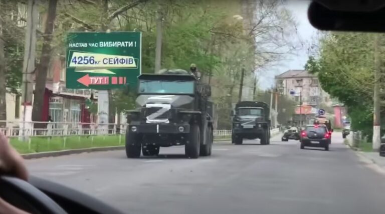 Z signs – a Russian pro-war symbol – have appeared around the city. Russian flags hang above Kherson’s government buildings. Ukrainian TV has been mostly cut off, changed to Russian news. Russian soldiers drive armoured vehicles through the city centre, between a network of check points.