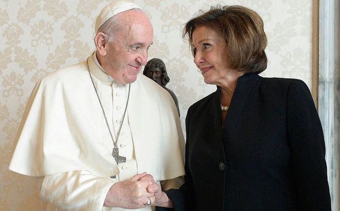 After Pelosi met former Pope Benedict in 2009, the Vatican said he had told her that legislators and other public figures should help create “a just system of laws capable of protecting human life at all stages of its development”.
