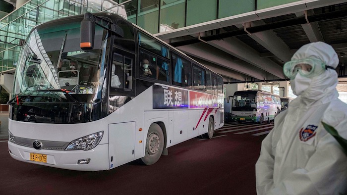 The researchers, who were required to complete 14 days in quarantine after arriving in China, left their quarantine hotel and boarded a bus in the midafternoon.